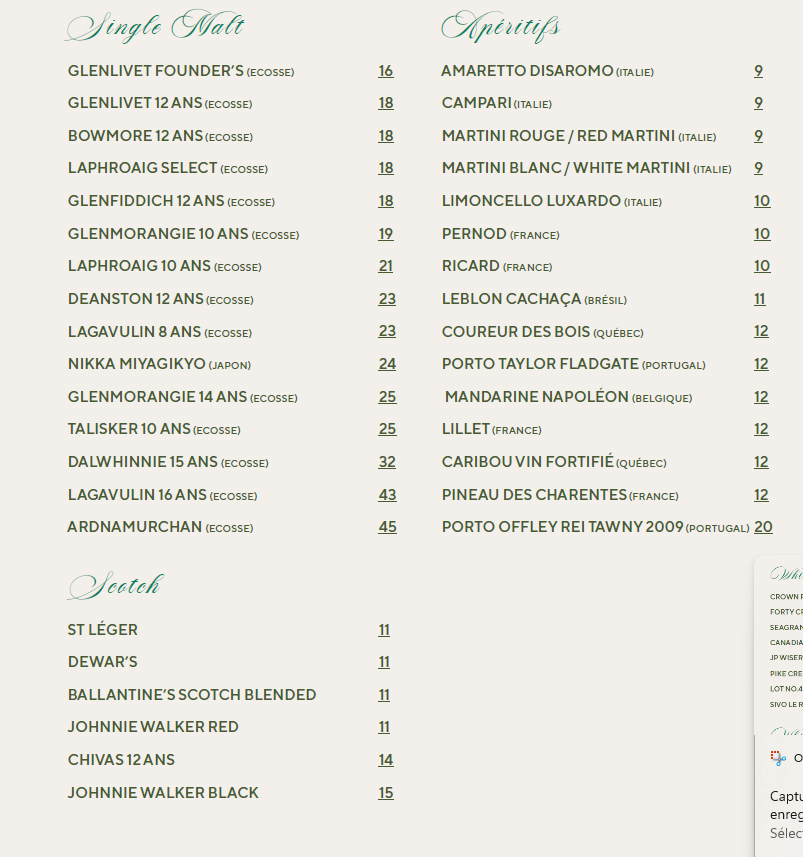 For the main course, indulge in the grilled beef fillet with gremolata sauce at CA$44.00, or savor the decadence of duck leg confit with Bordelaise sauce for CA$37.00. Don’t forget to treat yourself to a decadent dessert, such as the rich chocolate pear for CA$14.00.